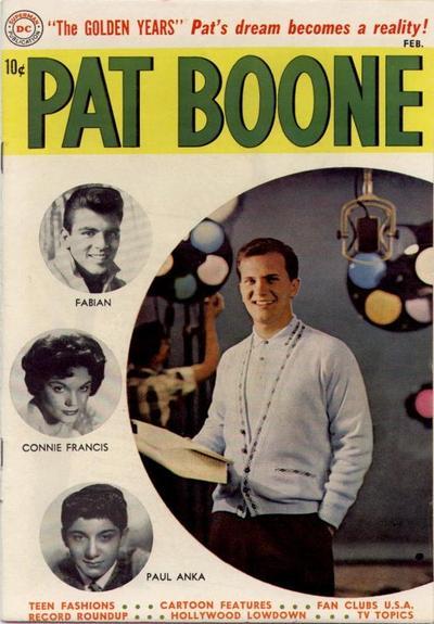 Pat Boone Photocover W/ smaller portraits of Fabian, Connie Francis, and Paul Anka on Cover., 3/4 inch spine split.